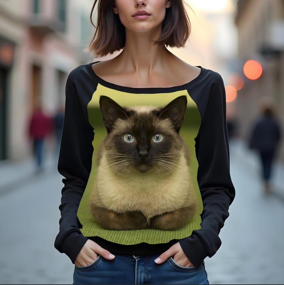 Світшот реглан з відкритими плечима в романтичному стилі з принтом "Сіамський кіт: кітСвітшот реглан з відкритими плечима в романтичному стилі з принтом “Сіамський кіт: кіт, кішка, погляд”