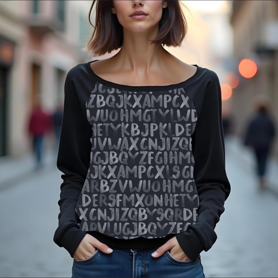 Світшот реглан з відкритими плечима в романтичному стилі з принтом "Текстура літерСвітшот реглан з відкритими плечима в романтичному стилі з принтом “Текстура літер, чорно-біле”