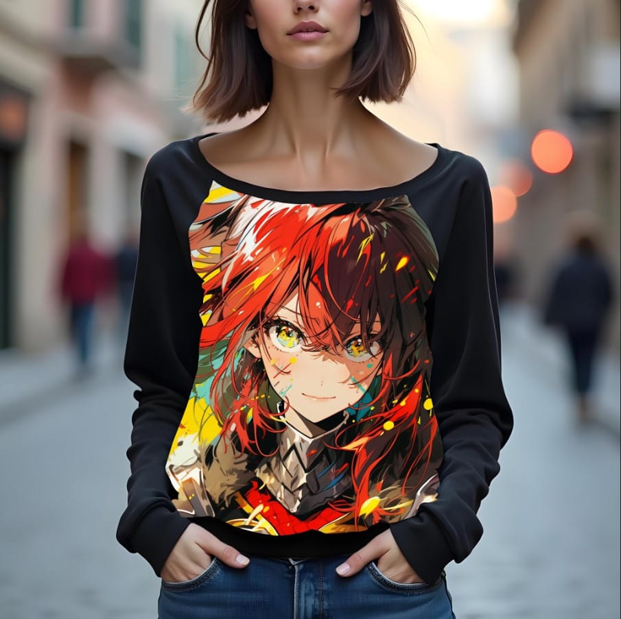 Світшот реглан з відкритими плечима в романтичному стилі з принтом "Дівчина-воїнСвітшот реглан з відкритими плечима в романтичному стилі з принтом “Дівчина-воїн, обладунки, фарба, аніме, яскраві”