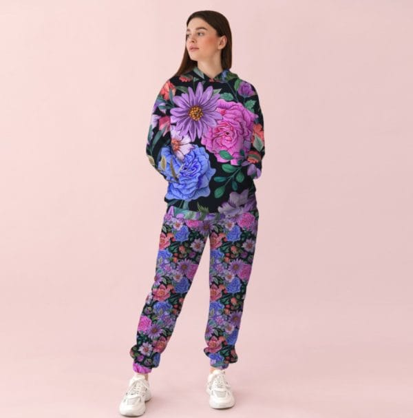 Жіночий чорний спортивний костюм із принтом квітковий орнамент. 0_022Жіночий чорний спортивний костюм із принтом квітковий орнамент. 0_022