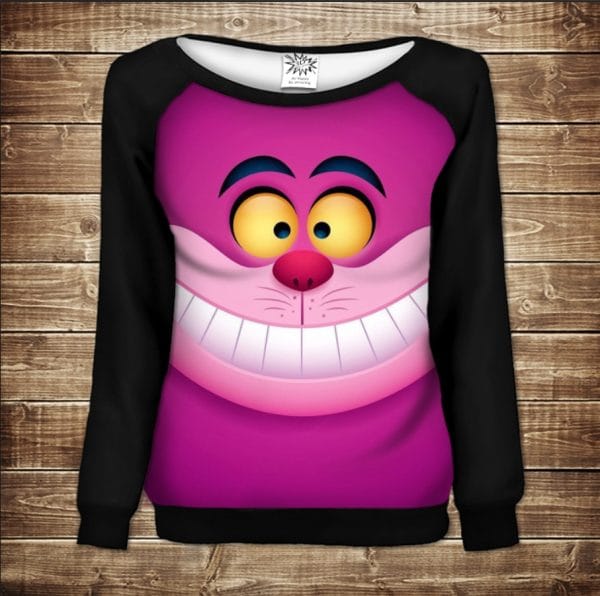 Жіночий світшот - реглан з відкритими плечима з 3D принтом Рожевий Чеширський кітЖіночий світшот – реглан з відкритими плечима з 3D принтом Рожевий Чеширський кіт